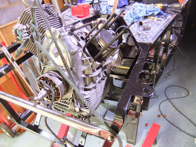 With both pistons now exposed the engine was then gently lowered and re secured in the chassis. Next job is to drain the oil from the sump and then remove the sump cover, which will, along with the heads, cylinders and carbs be taken for professional cleaning, but that's enough for today.